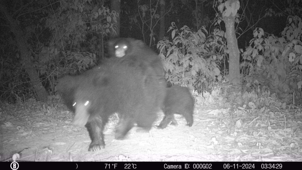 A sloth bear mother with cubs captured during camera trapping outside protected area along the Siwalik corridor.