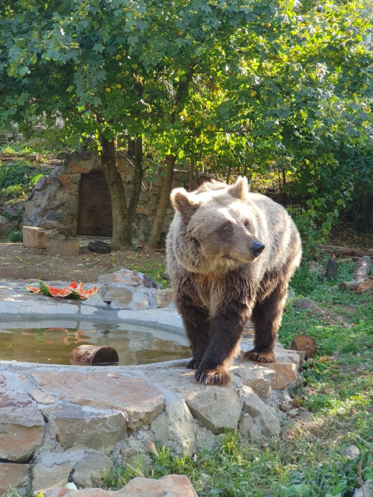 The sanctuary is 20,000m2 in size, has a large pool for the bears to drink/swim/cool down and play in, with a waterfall. It is part of the surrounding natural forest which borders the zoo and it has 11 artificial dens and two small wooden shacks for the bears to shelter from the weather or hibernate in. Before entering the Bear Forest, visitors are walking through ‘Karpatica’, a series of simulated Romanian-style houses with informative and interactive educational material for young and old. About the biology and ecology of bears in general, threats to bears and their habitat, and of course about Bears in Mind and their projects around the globe.